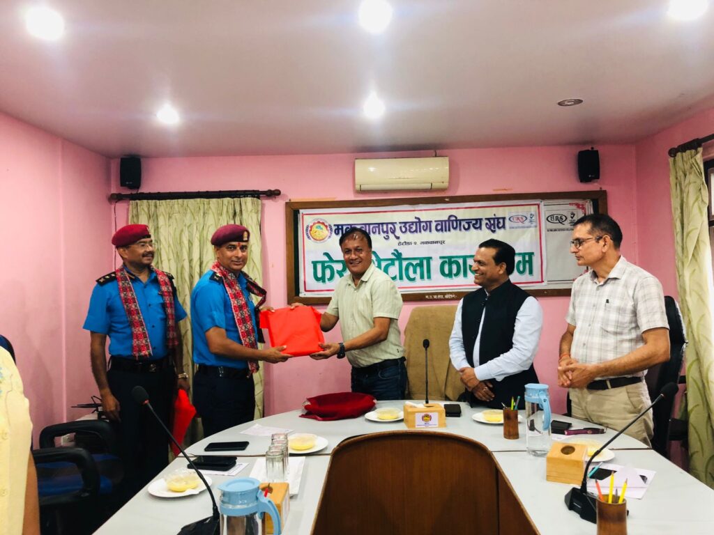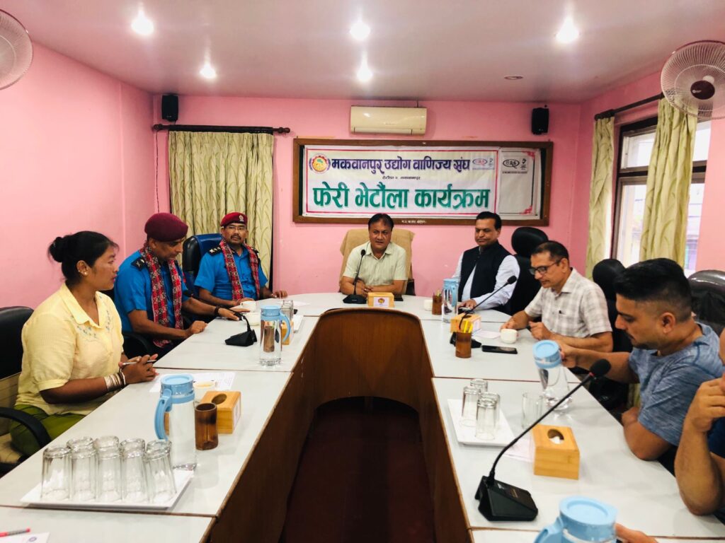 मकवानपुर उद्योग वाणिज्य संघको आयोजनामा प्रहरी उपरीक्षक विश्वराज खड्का र प्रहरी नायव उपरीक्षक श्यामु अर्यालसंग शुक्रबार हेटौंडामा छलफल कार्यक्रम आयोजना गरिएको थियो । मउवासंघका अध्यक्ष प्रमोद सिंह रानाभाटको अध्यक्षतामा मकवानपुर जिल्लाबाट आफ्नो सेवा पूरा गरी अन्यत्र सरुवा हुने क्रममा रहनुभएका प्रहरी उपरीक्षक र प्रहरी नायव उपरीक्षकसंग छलफल कार्यक्रम आयोजना गरिएको हो । मउवासंघमा आयोजना गरिएको कार्यक्रममा अध्यक्ष रानाभाटले मन्तव्य राख्नुहुदै जिल्लाको सुरक्षा व्यवस्था कायम गर्न सफल नेतृत्व प्रदान गर्नुभएकोमा प्रहरी उपरीक्षक र प्रहरी नायव उपरीक्षकलाई धन्यवाद व्यक्त गर्नुहुदै मउवासंघको निर्वाचन मर्यादित गर्न सुरक्षा सुनिश्चितताका साथै व्यवसायिक समस्याहरु हल गर्न सक्रिय भइदिनुभएकोमा आभार व्यक्त गर्नुभएको थियो । भावी दिनमा पनि सधैं साथ पाइने अपेक्षा सुनाउनुहुदै दुवैजनाको थप प्रगतिको कामना गर्नुभएको थियो । कार्यक्रममा प्रहरी नायव उपरीक्षक श्यामु अर्यालले सुरक्षा बिना उद्योग/व्यवसाय चल्न नसक्ने बताउनुभएको थियो । उहाले लागूऔषध नियन्त्रणमा उल्लेख्य काम गर्न सकेको, चाडपर्वको समयमा चोरीका घटना बढ्न सक्ने भएकाले सचेत हुनुपर्ने, बजारको सिसिटिभी मर्मत गरेर दुरुस्त राख्नुपर्ने, व्यवसायी र प्रहरी दुवैको मनोबल उठाउन आवश्यक रहेको र दुवैपक्षको सहकार्य पनि जरुरी रहेको उहाको धारणा थियो । त्यसैगरी प्रहरी उपरीक्षक विश्वराज खड्काले जिल्लाबाट विदाइको क्रममा रहदा कार्यक्रम आयोजनाप्रति आभार व्यक्त गर्नुहुदै मकवानपुर जिल्लामा एक वर्ष सेवा अवधि पूरा गरेकाले नियमित सरुवाको चरणमा रहेको, मकवानपुर जिल्लाको व्यवसायिक वातावरण सहज पाएको, रात्रिकालिन होटल संचालनका लागि सुरक्षा व्यवस्थासहित सहजता निर्माण गरिएको, गाजा, अफिम, चरेश जस्ता लागूऔषध समातिएको, जिल्लामा दुव्र्यशनीको संख्या अधिक पाएको, यस पटकको दशैंमा सुरक्षा व्यवस्था कायम गर्ने योजना बनिसकेको जस्ता भनाइहरु राख्नुभएको थियो ।