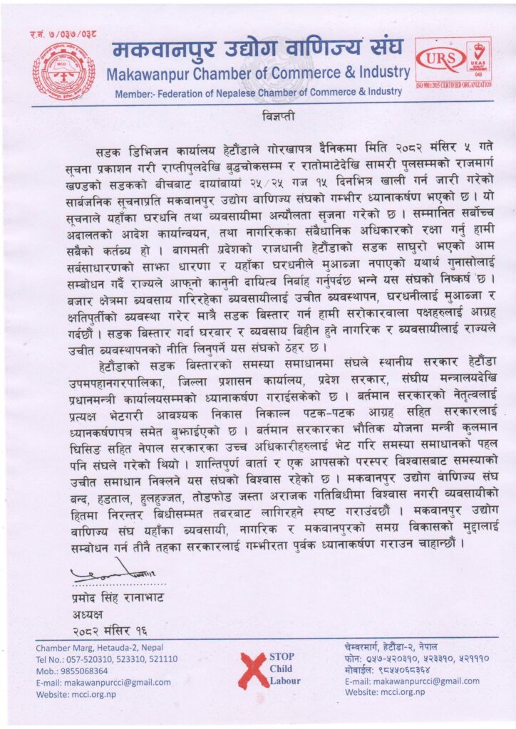MCCI is committed to the promotion of commerce and industry in the region as well as the overall economic development of the country. MCCI has made significant contributions to trade and Industry in Makawanpur.