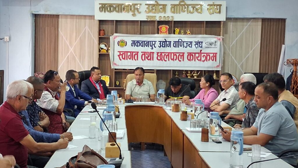 मकवानपुर उद्योग वाणिज्य संघमा मंगलबार प्रतिनिधि सभा सदस्य प्रकाश गौतमसंग छलफल कार्यक्रम गरिएको थियो । मउवासंघका अध्यक्ष प्रमोद सिंह रानाभाटको अध्यक्षतामा कार्यक्रम भएको हो । कार्यक्रममा मन्तव्य राख्नुहु“दै मउवासंघका अध्यक्ष प्रमोद सिंह रानाभाटले एम.आर.पि. अनिवार्य गर्नुपूर्व व्यवसायीलाई पर्याप्त समयसीमा र सचेतना कार्यक्रम चलाउनुपर्ने, वीरगंज जानुपर्ने बाध्यता हटाउन हेटौंडामा नापतौल कार्यालय स्थापना गर्नुपर्ने, भारतीय पर्यटकहरुलाई थप आकर्षित गर्न पूर्वाधार विकासमा लगानी बढाउन पर्ने, भीडभाड भइरहने हेटौंडा अस्पतालमा गएर नजिकै रहेको हेटौंडा आ“खा अस्पतालको लागि रिफर लिनुपर्ने बाध्यता हटाउनुपर्ने, क्रशर उद्योगलाई पुनः संचालनमा ल्याउन नियमन गर्नुपर्ने, विस्तारित मयुरधाप औद्योगिक क्षेत्र सिघ्र संचालनमा ल्याउनुपर्ने, सडक विस्तारको अन्यौलता हटाउनुपर्ने जस्ता धारणा राख्नुभएको थियो ।